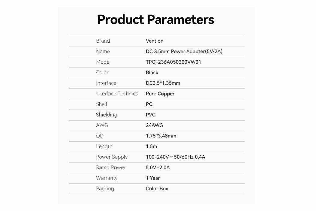 Specifications : 🔹 Length : 1.5M 🔹 Connector Interface : DC3.5mm x 1.35mm 🔹 Connector Material : Nickel-plated 🔹 Shell : PC 🔹 Conductor : Pure Copper 🔹 Shielding : PVC 🔹 Power Supply : 100-240V ~ 50/60Hz 0.4A 🔹 AWG : 24AWG 🔹 Jacket : PVC