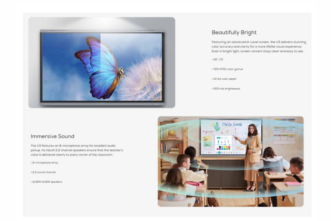 MAXHUB Edu U Series telah disesuaikan dengan kebutuhan tersendiri dalam dunia edukasi, seperti firmware terbaru untuk persiapan kelas, terdapat pula di dalamnya software pengajaran MAXHUB Class. Selain itu, MAXHUB Edu U Series telah tersertifikasi Google dan bisa dengan mudah terkoneksi dengan perangkat IFPD guna mempermudah guru dalam mengendalikan apa yang ditayangkan di layar, kemudian juga kemampuan untuk murid dapat share screen and share ideas secara wireless, serta dapat melakukan remote untuk mengatur seluruh perangkat di masing-masing institusi.