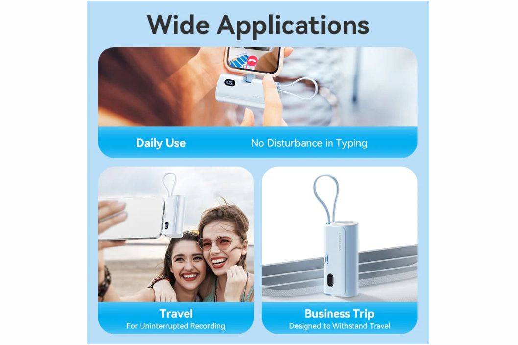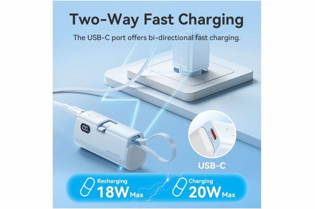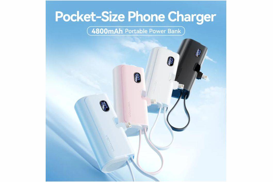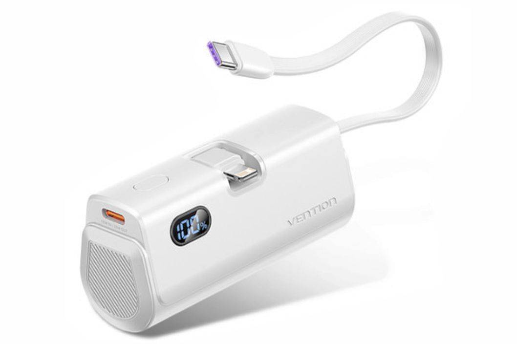 SPECIFICATIONS:🔹 Brand : Vention🔹 Product : 4800mAh Power Bank🔹 Color : White/Black🔹 Battery Capacity : 4800mAh (3.7V/17.76Wh)🔹 Input (USB-C) : 5V-3A; 9V-2A (18W Max)🔹 Output (USB-C) : 5V-3A; 9V=2.22A; 12V=1.67A (20W Max)🔹 Output (Built-in USB-C Cable)FHR : 5V-3A; 9V-2A; 10V=2.25A; 12V-1.5A (22.5W Max)🔹 Output (Built-in Lightning Interface)FHR : 5V-2.4A (12W Max)🔹 Total Output : 5V-3A