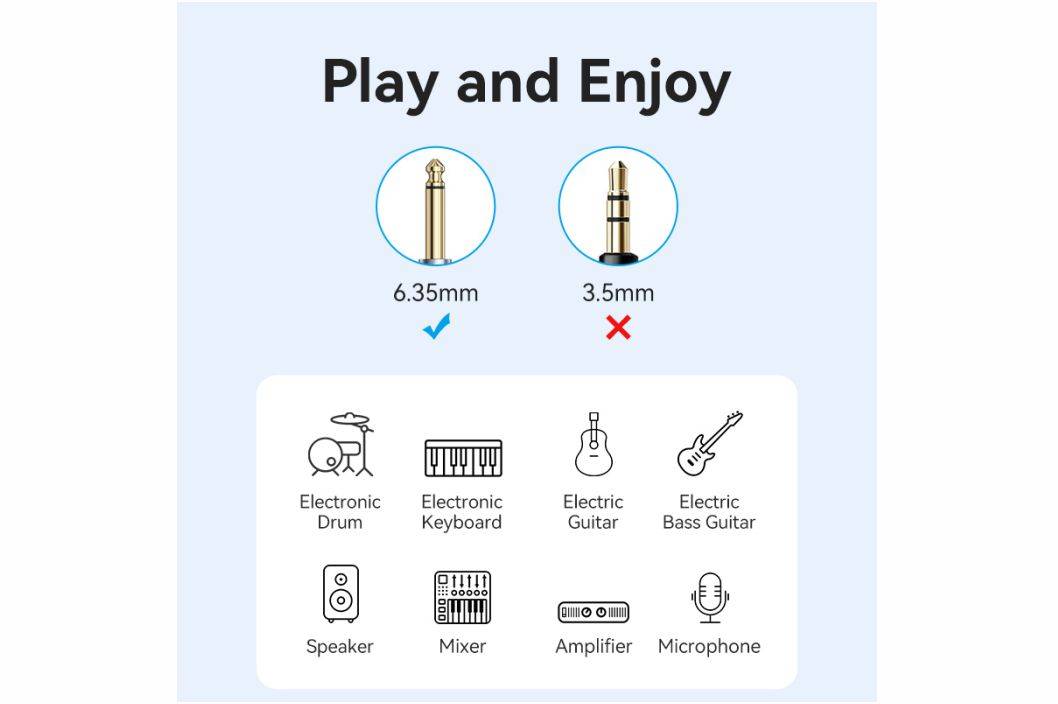 SPESIFICATION :🔹Brand : Vention🔹Product : 6.5mm TS Male to Male Right Angle Audio Cable🔹Color : Gray🔹Interface : 6.5mm TS Male🔹Electroplating Process : Gold Plated🔹Conductor : Bare Copper🔹Shielding : Copper Spiral🔹AWG : 27AWG🔹Jacket : TPE + Cotton Braided🔹OD : 6.0mm🔹Length : 1m – 10mGaransi Resmi 2 Tahun di luar human error.